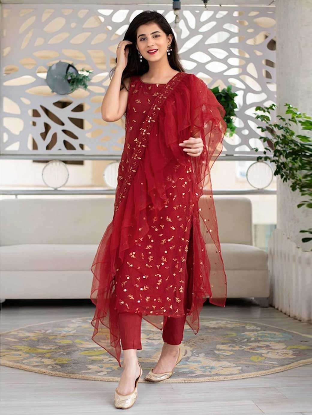 Top Length : 42 ( Inch) ||Top Width Size : 58 ( Inch) || Bottom Length : 2.2 MTR || Duptta Length : 2.25 MTR|| Inner Length Fit : Regular