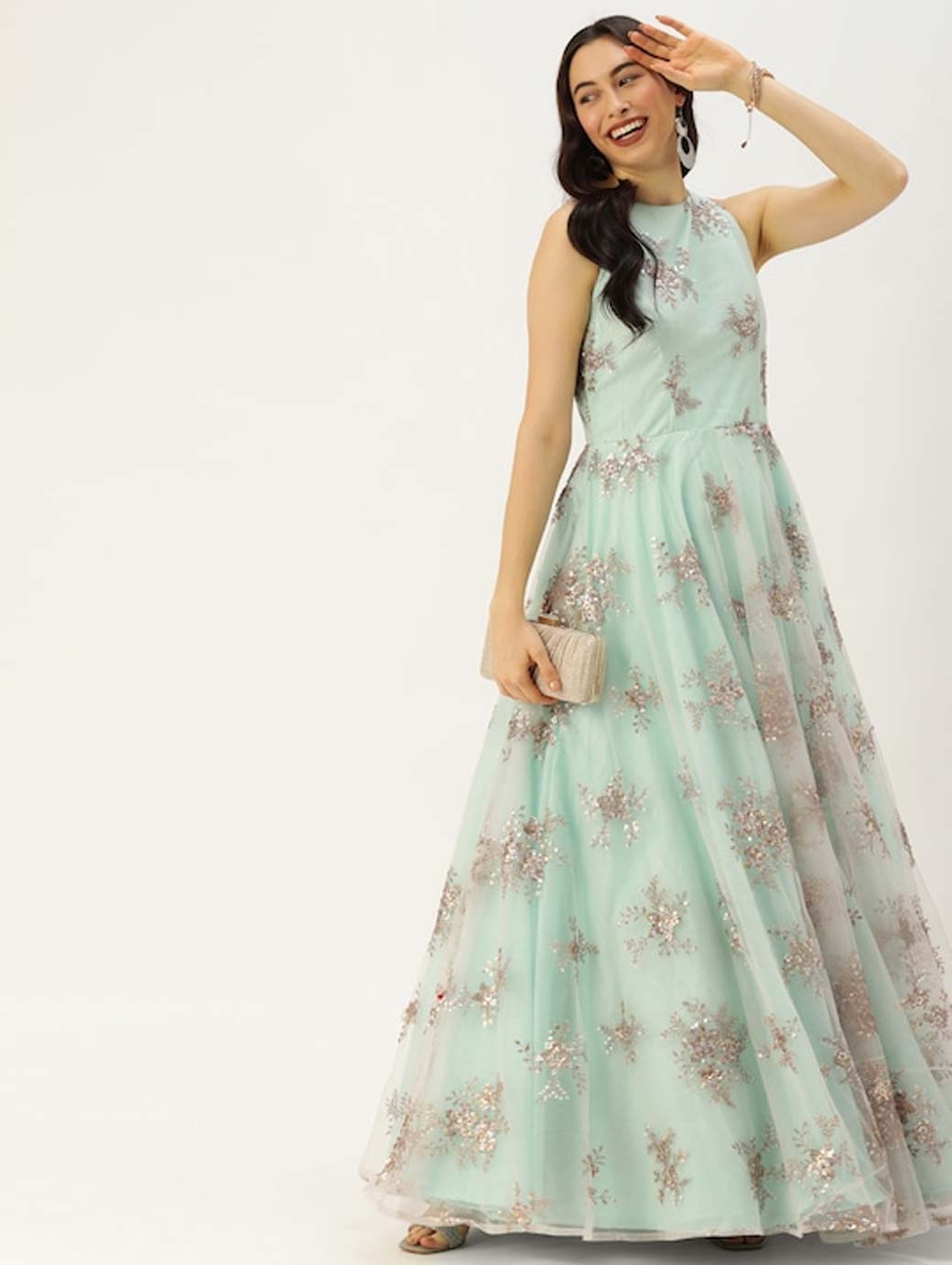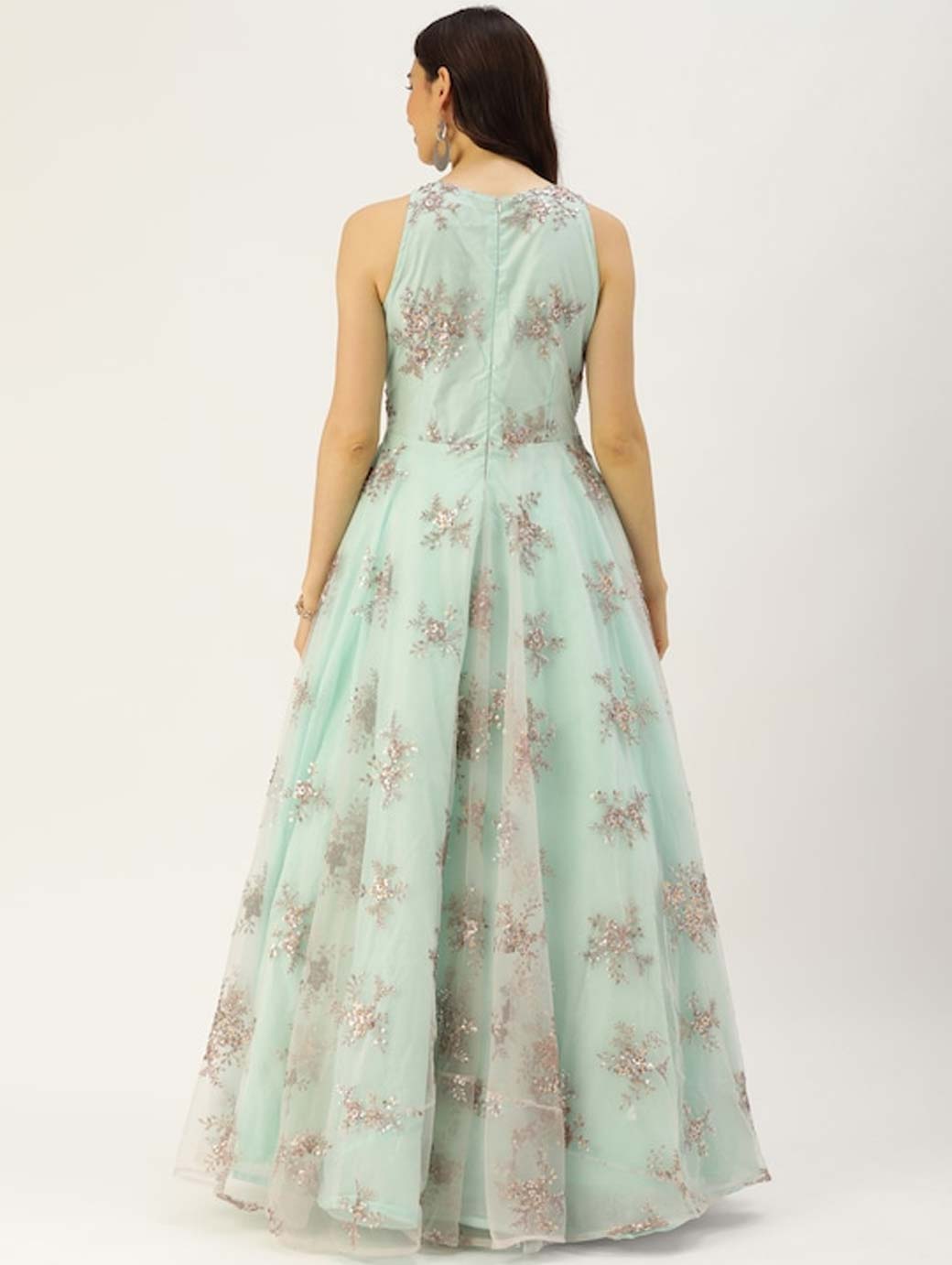 Green and golden sequinned Made to Measure Maxi Gown Round neck Sleeveless, no sleeves Gathered or pleated detail Maxi length in flared hem Net fabric Concealed zip closure What is Made to Measure? Customised gown according to your Bust and Length. So please refer to the Size Chart to pick your perfect size.
