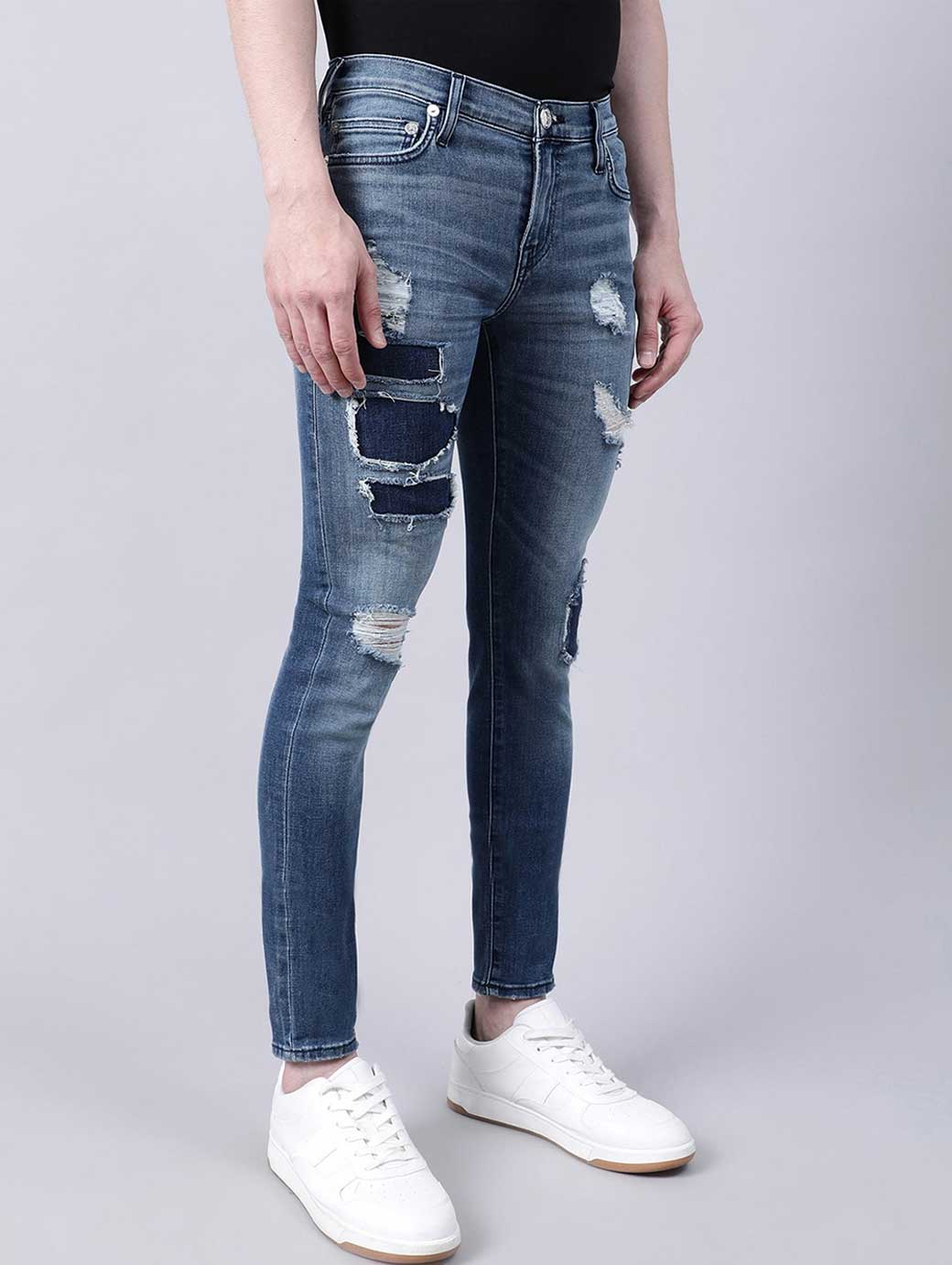 - Medium shade, heavy fade blue jeans