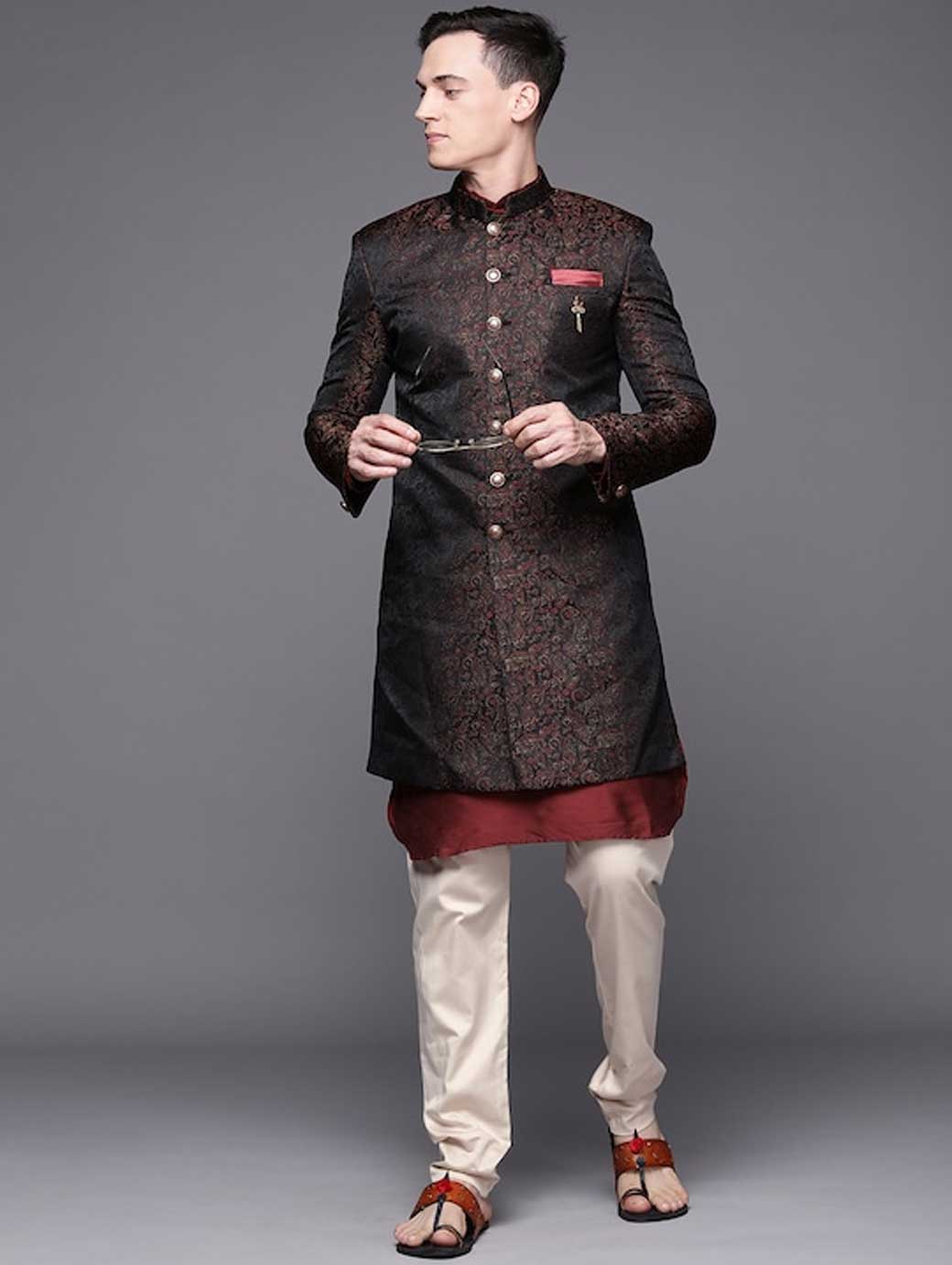 Men Maroon & Brown Ethnic Motifs Sherwani Maroon solid kurta, has a mandarin collar, long sleeves, side slits and 2 pockets Brown ethnic motifs woven design jacket, has a band collar, long sleeves and side slits Cream-coloured solid pyjama, has an elasticated waistband with drawstring closure and 2 pockets