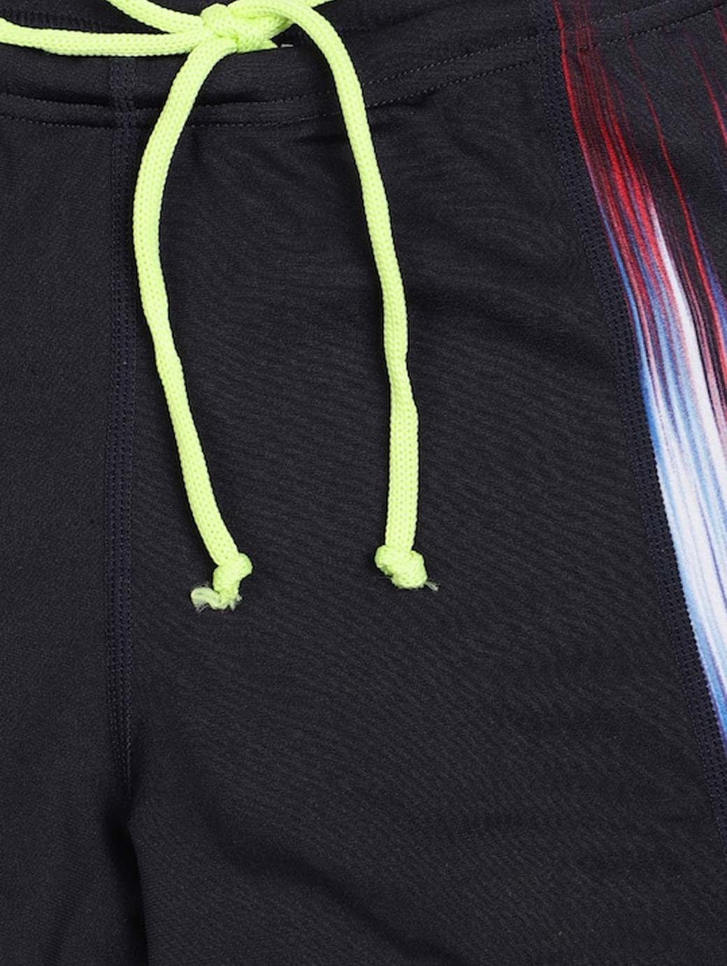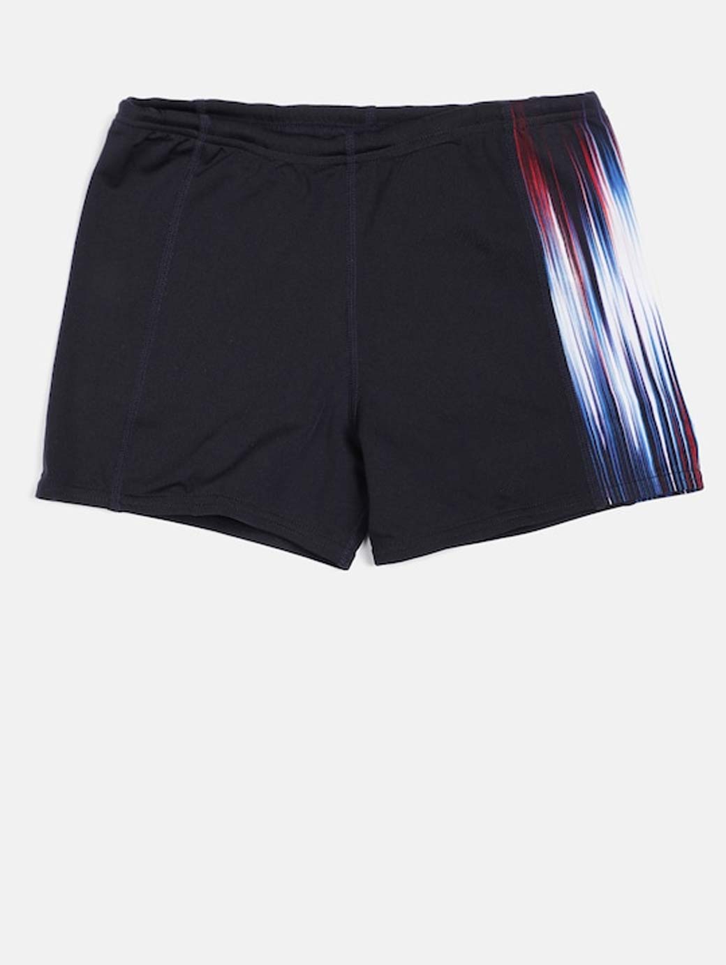A pair of blue knitted mid-rise swim shorts with printed detail, has an elasticated waistband with a drawstring fastening, 100% chlorine resistant, made with Endurance(r)+ fabric retains its shape and resists fading longer than any other swim material,