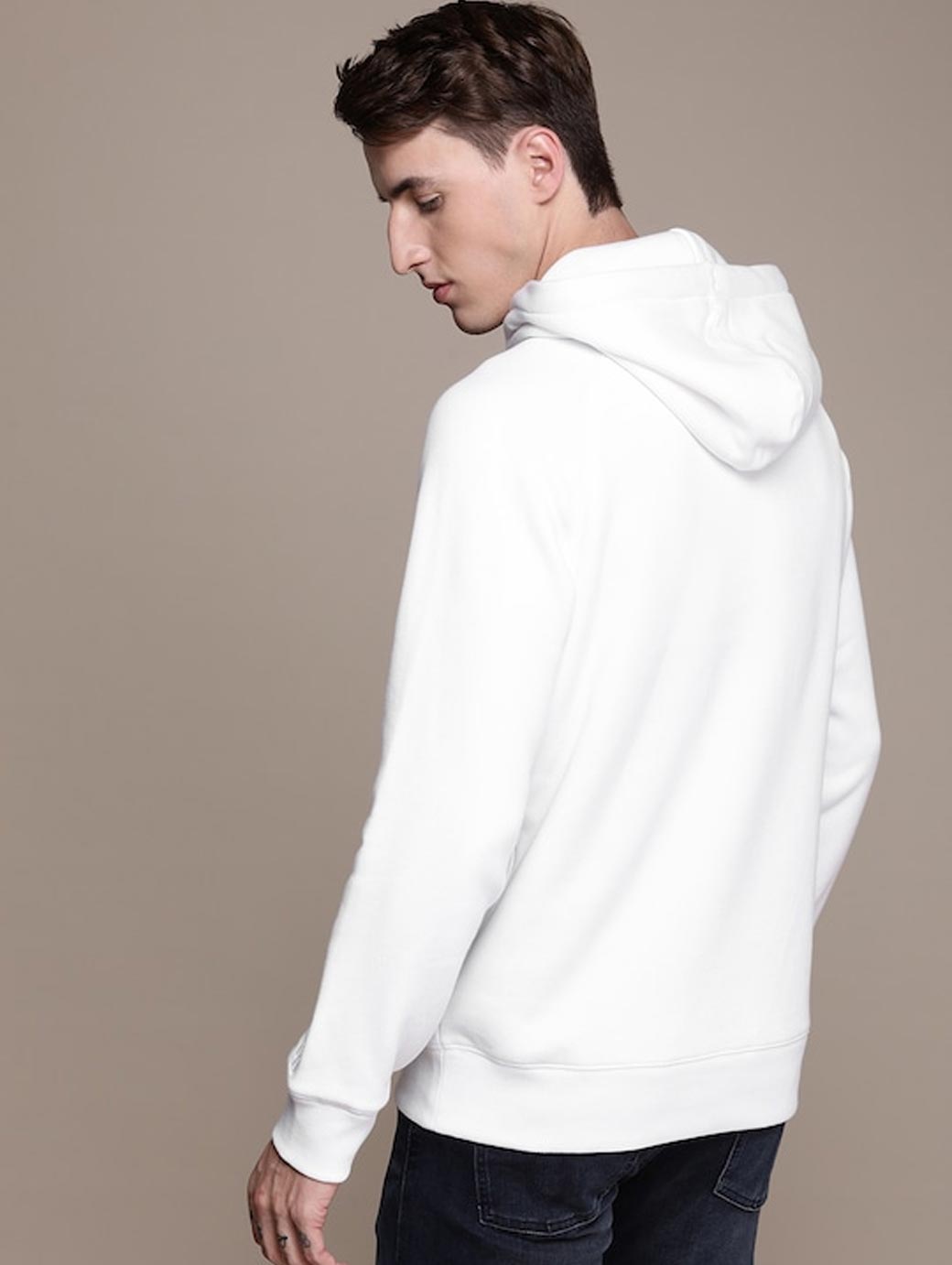 White printed sweatshirt has a hood, 2 insert pocket pockets, long sleeves, closure, ribbed hem