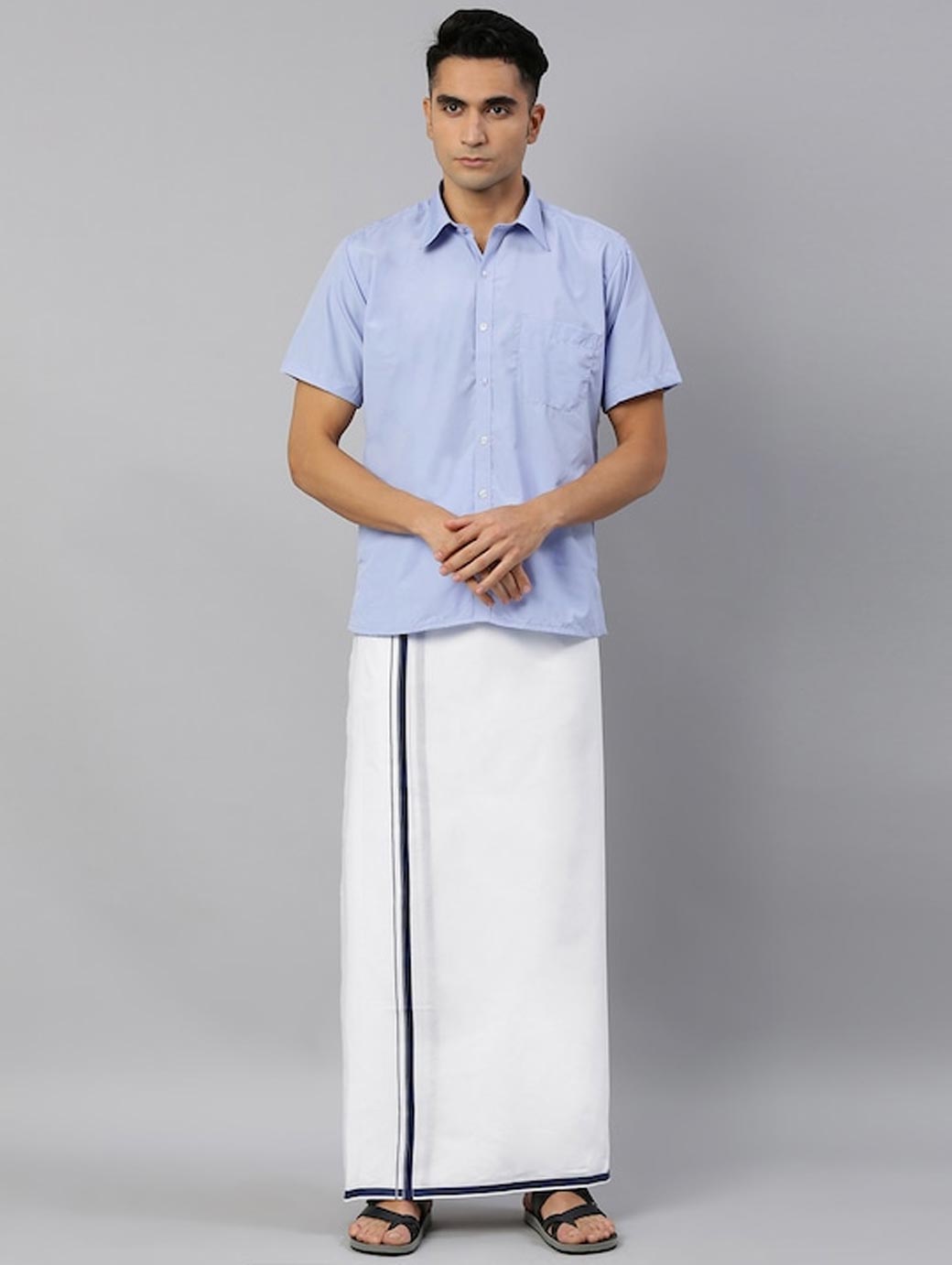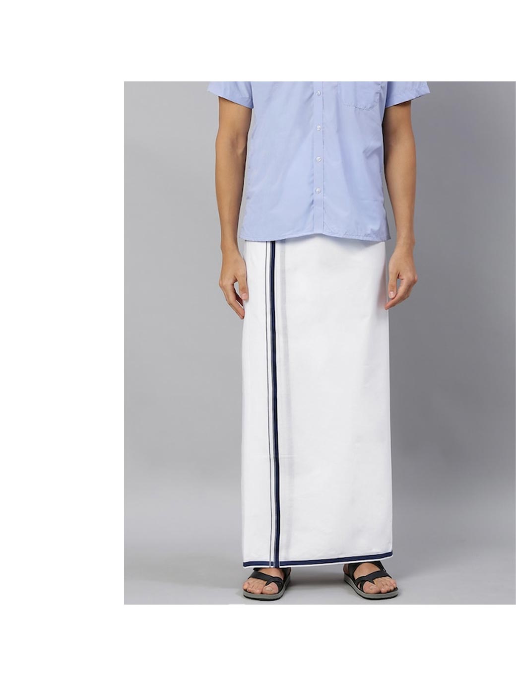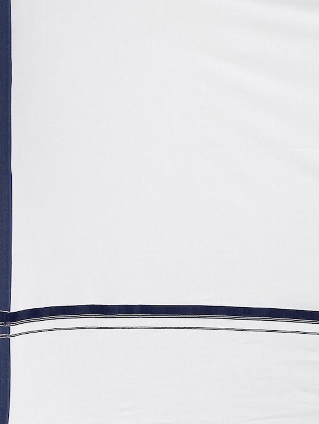 White solid dhoti, has a contrast navy blue border