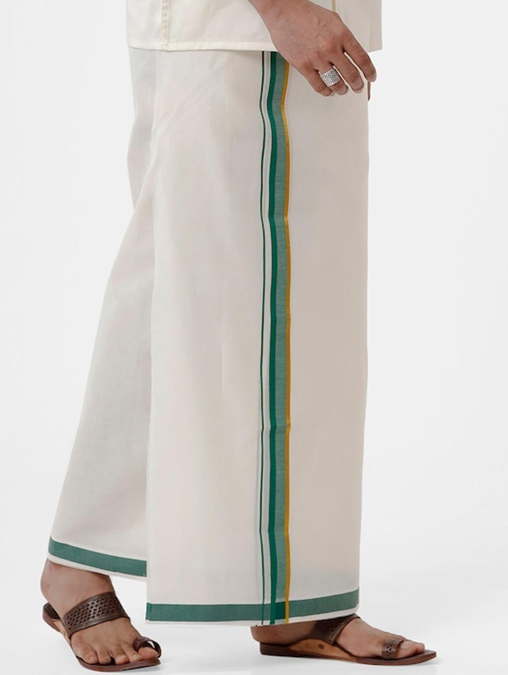 White solid mid-rise dhoti, has a green border