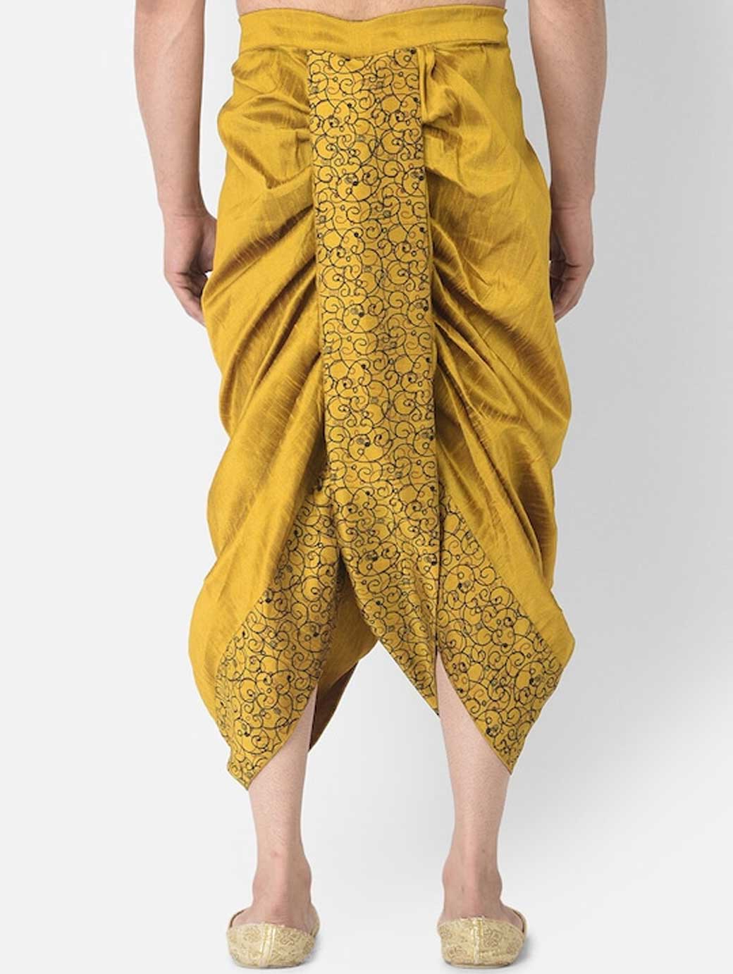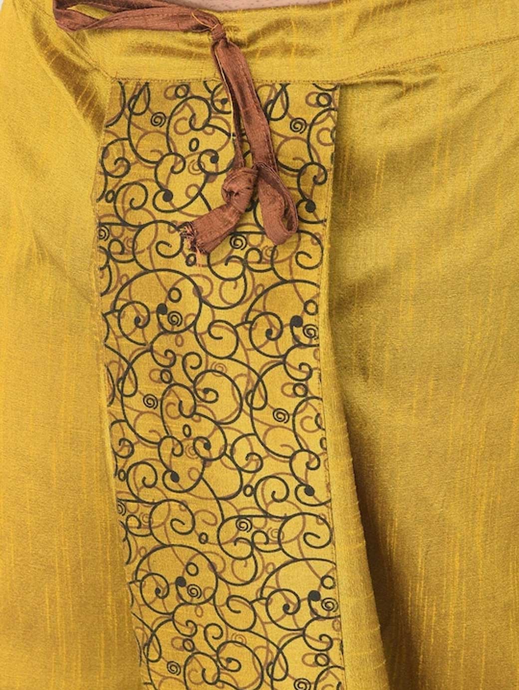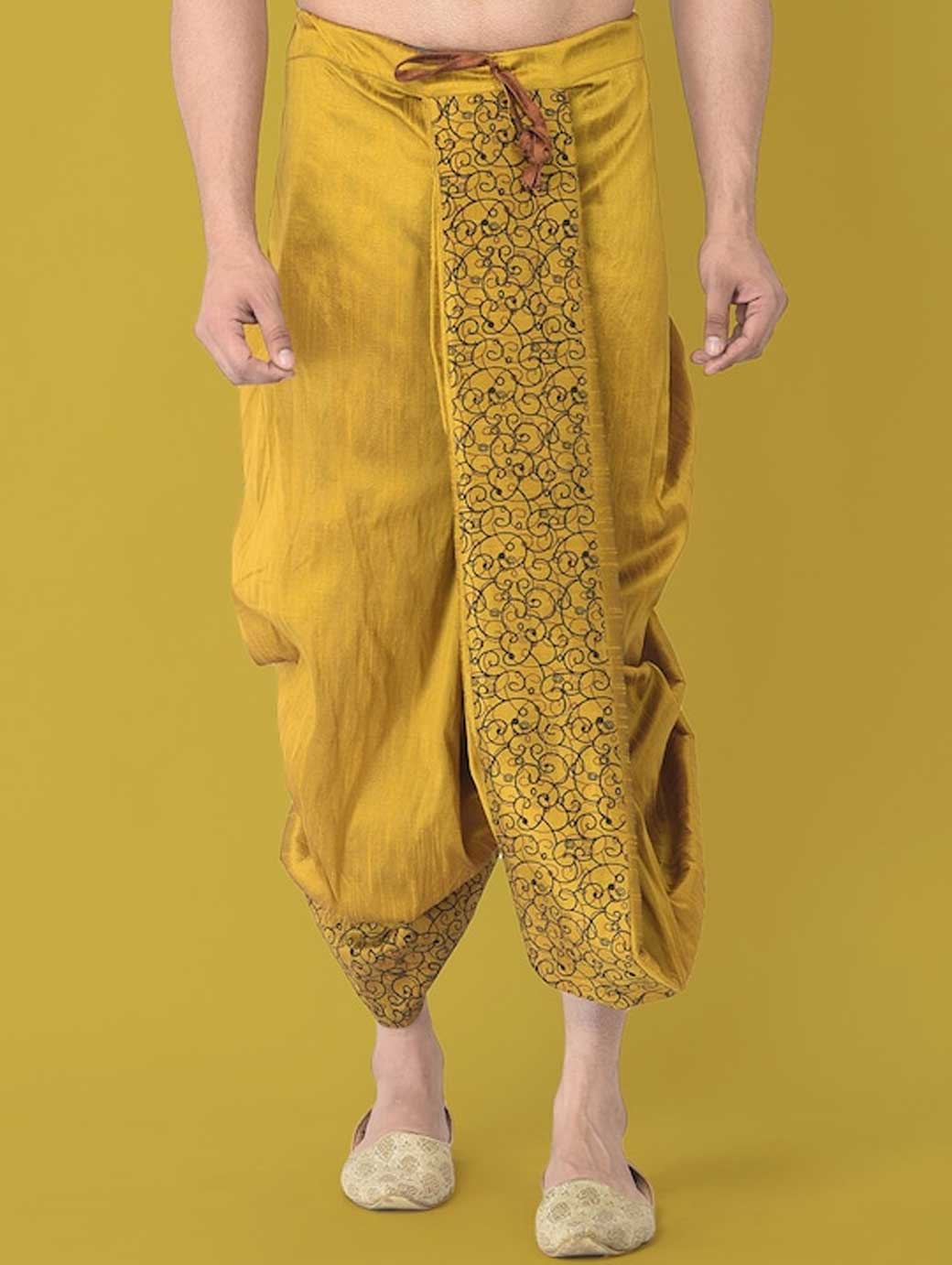 Yellow Color solid regular-fit dhoti pants with black printed detail in front and back, has gathers and pleats, and an elasticated waistband with a drawstring fastening