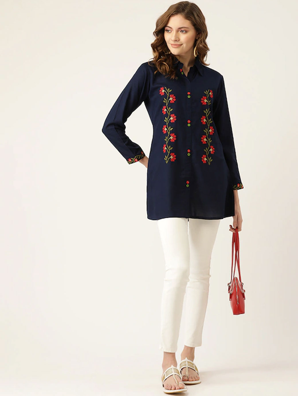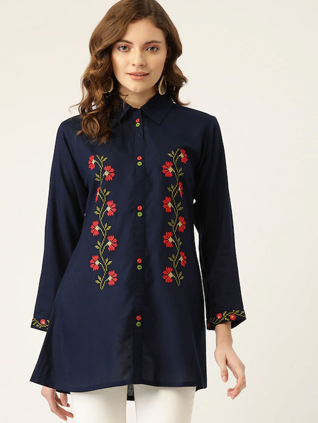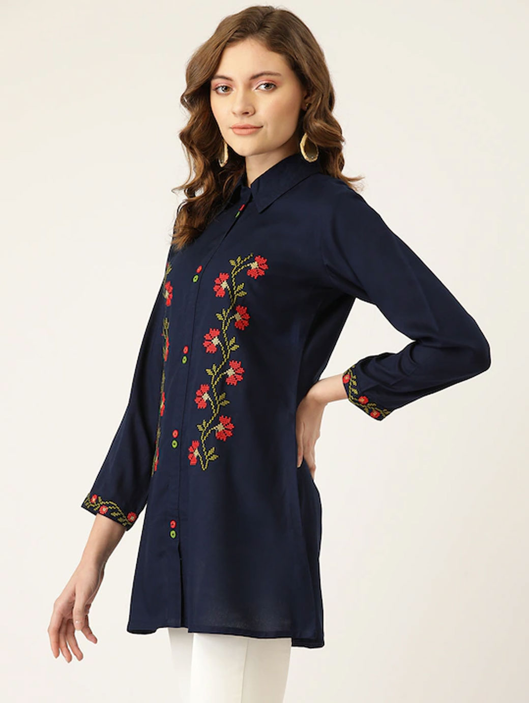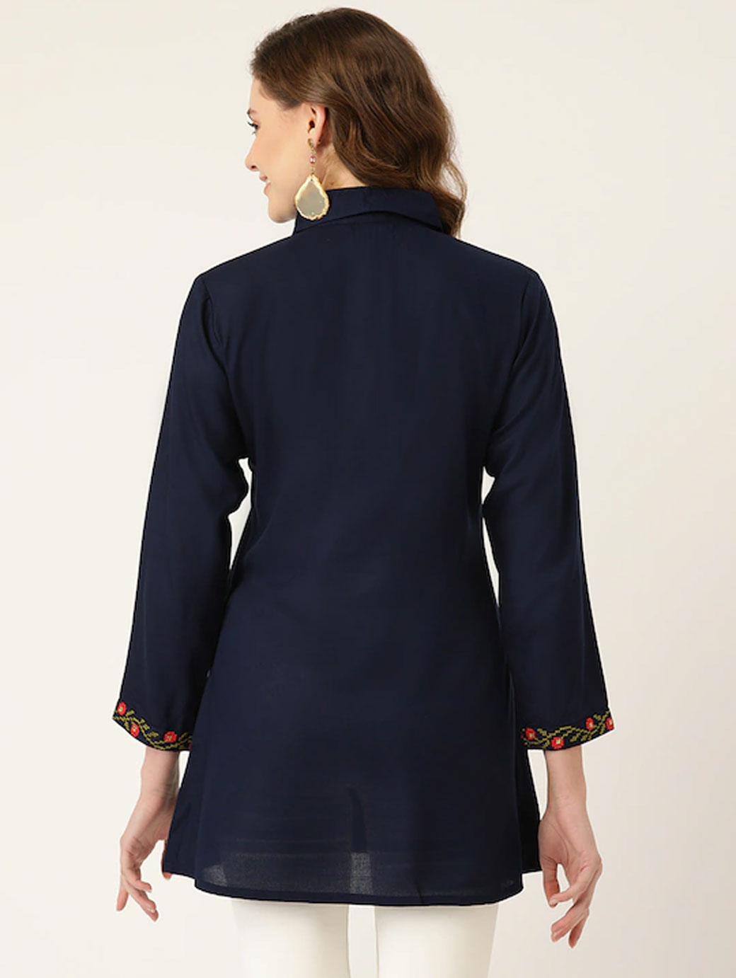 Navy blue embroidered tunic ,has a shirt collar, three-quarter sleeves, embroidered detail.