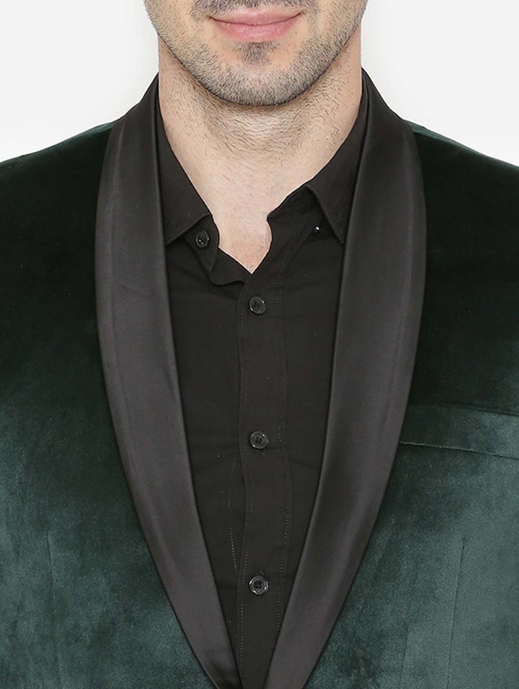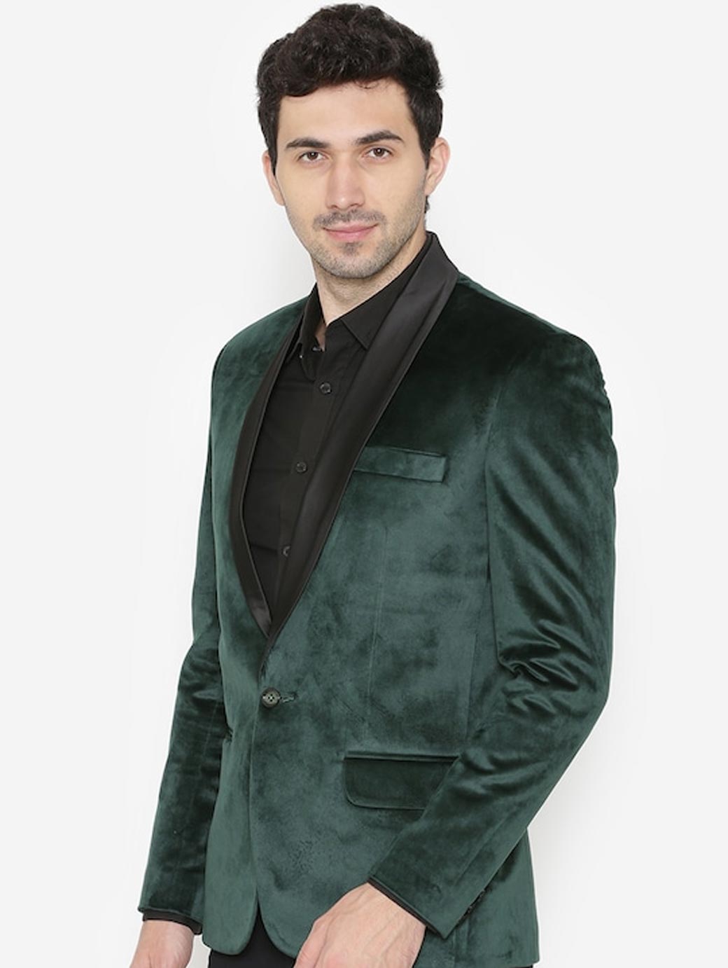 Green solid velvet blazer, has a shawl collar, single-breasted with a single button closure, long sleeves, two flap pockets, one chest welt pocket