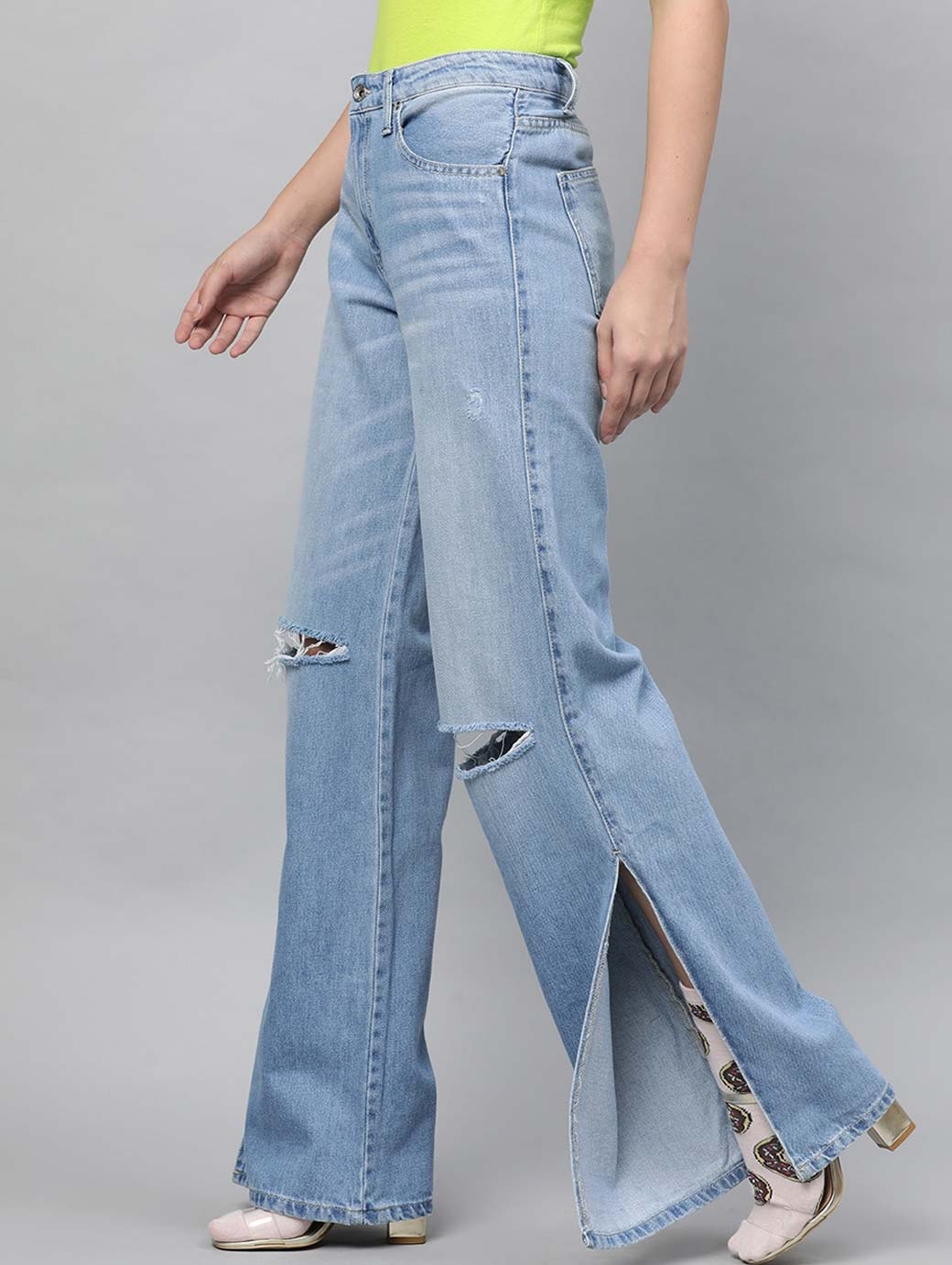 Blue light wash 5-pocket mid-rise jeans, slash knee, light fade, has a button and zip closure, and waistband with belt loops