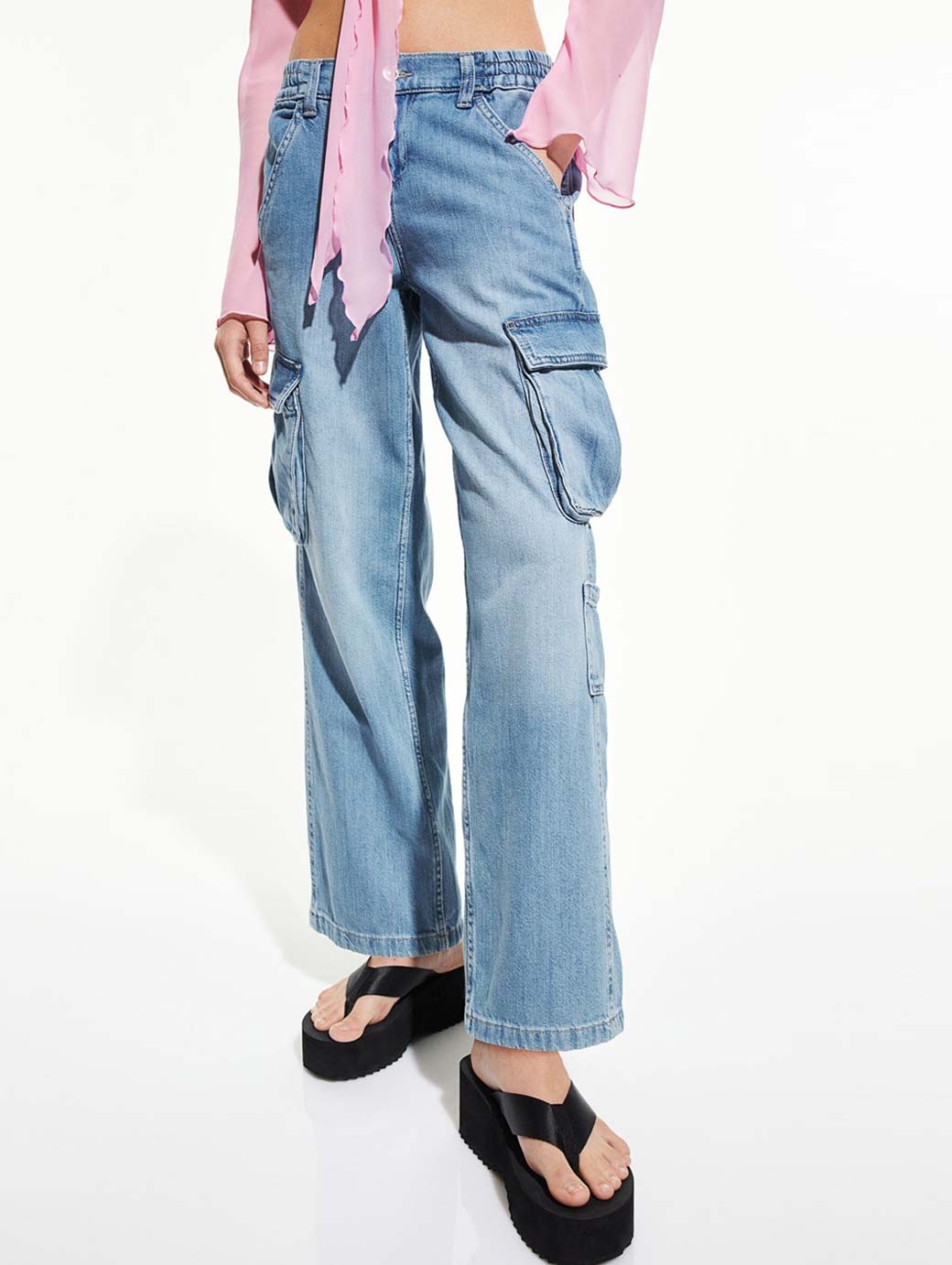Loose-fit cargo jeans in sturdy cotton denim. Low waist with covered elastication, a zip fly and button, diagonal side pockets, a flap leg pocket on both legs and an open pocket on one leg. Straight legs.