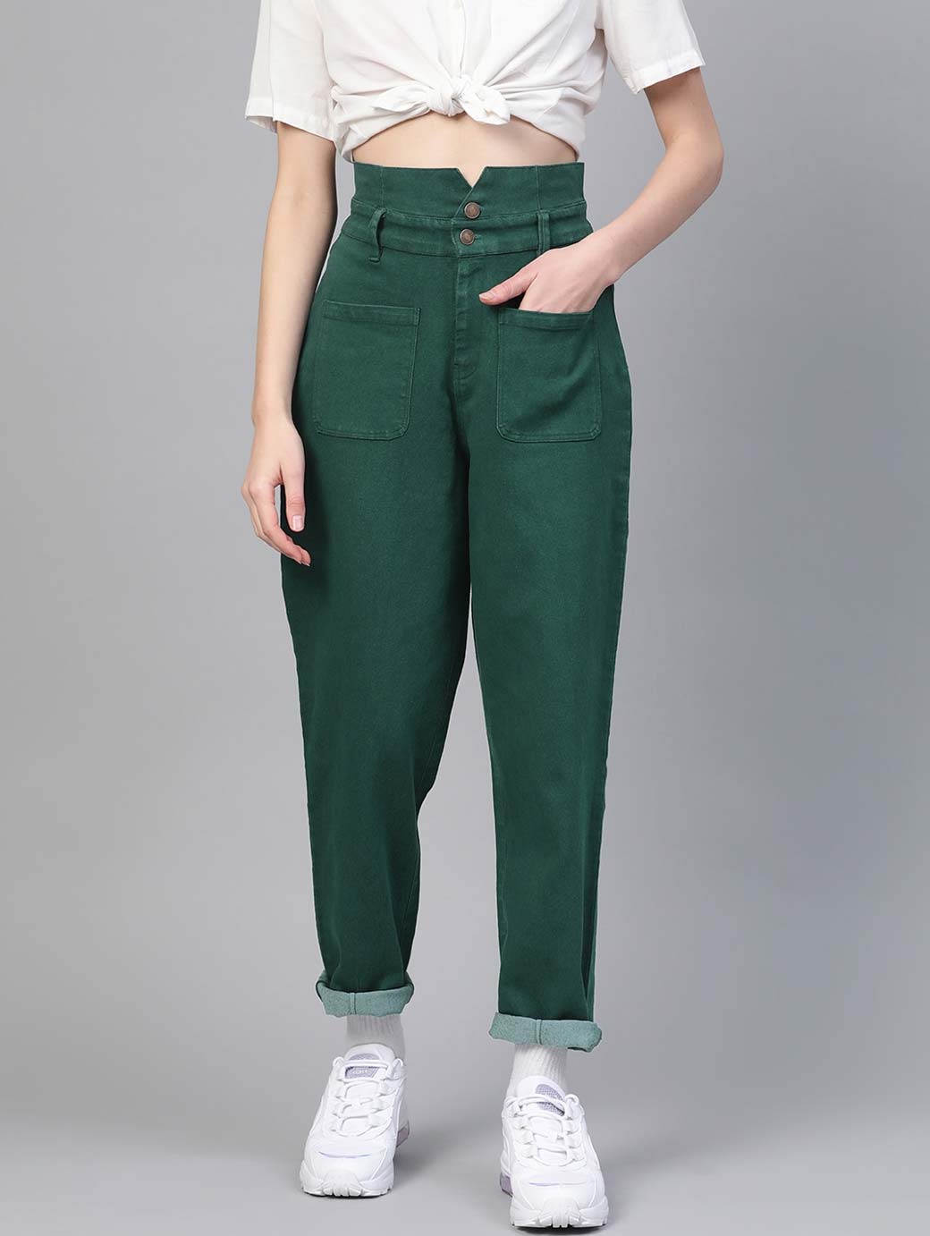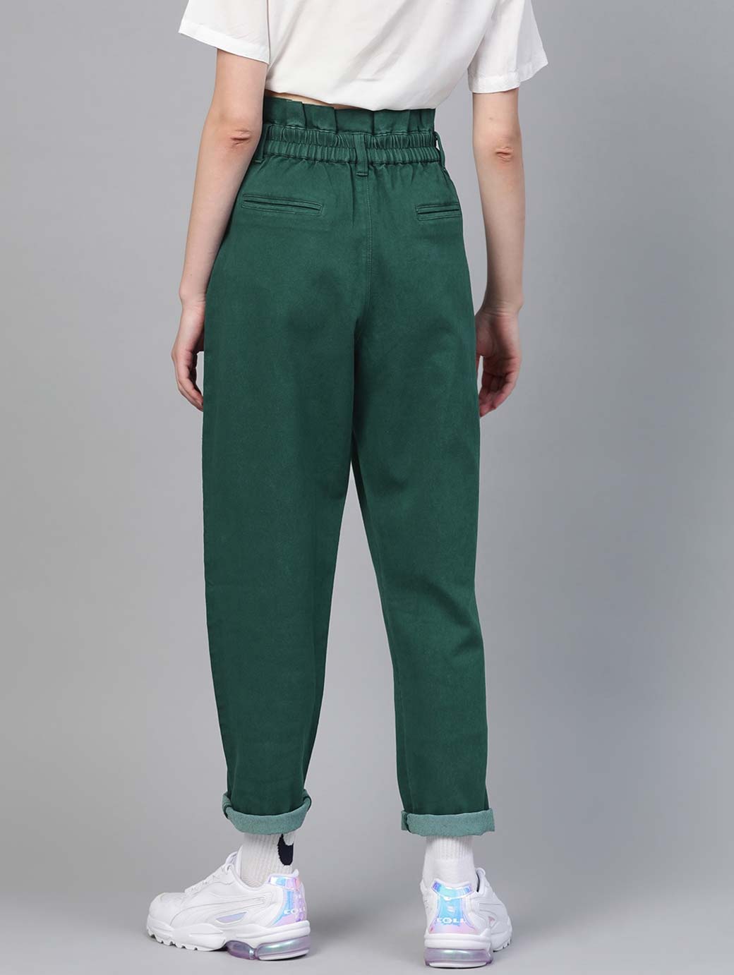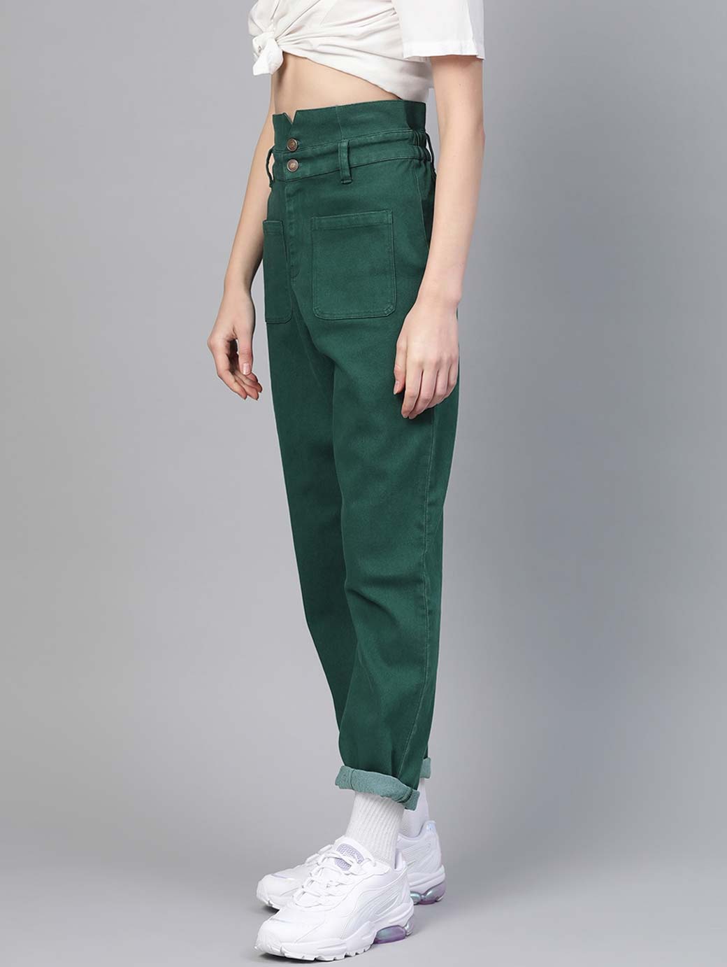 Green coloured wash 4-pocket high-rise jeans, clean look, no fade, has a button and zip closure, and paperbag waistband with belt loops