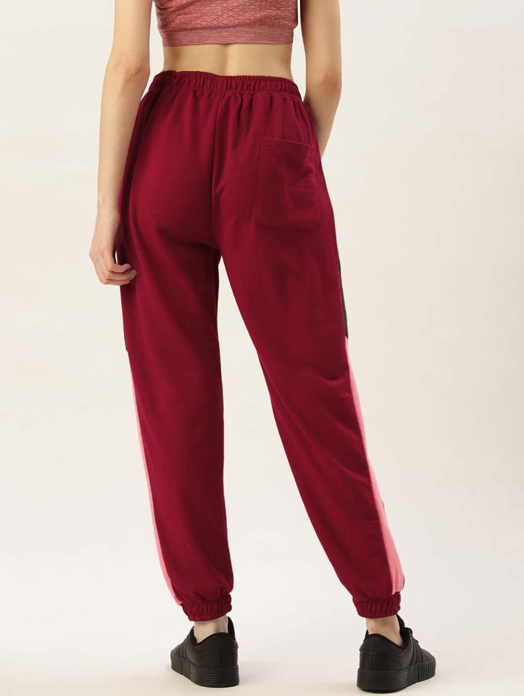Maroon solid side striped joggers, has elasticated waistband with drawstring closure, 3 pockets and cuffed hem