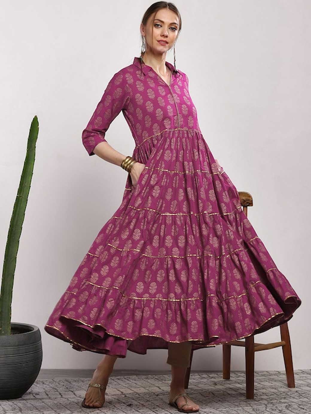 Pink Printed Tiered Anarkali Kurta, has a round neck, three-quarter sleeves, and flared hem This product does not come with a mask. The mask on the model is only for styling purpose.