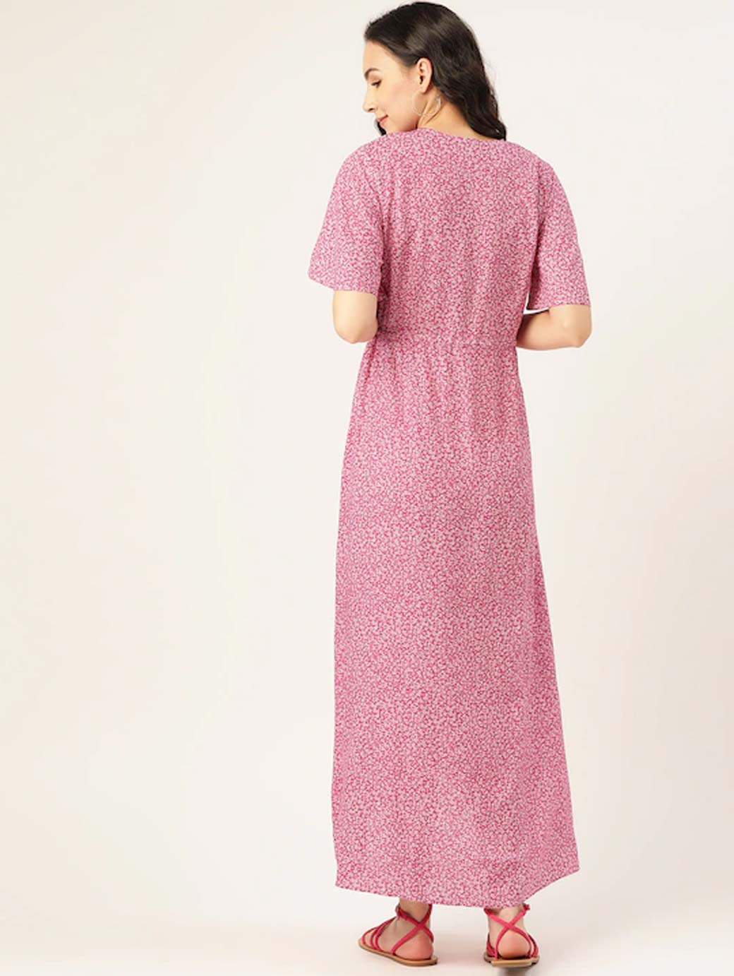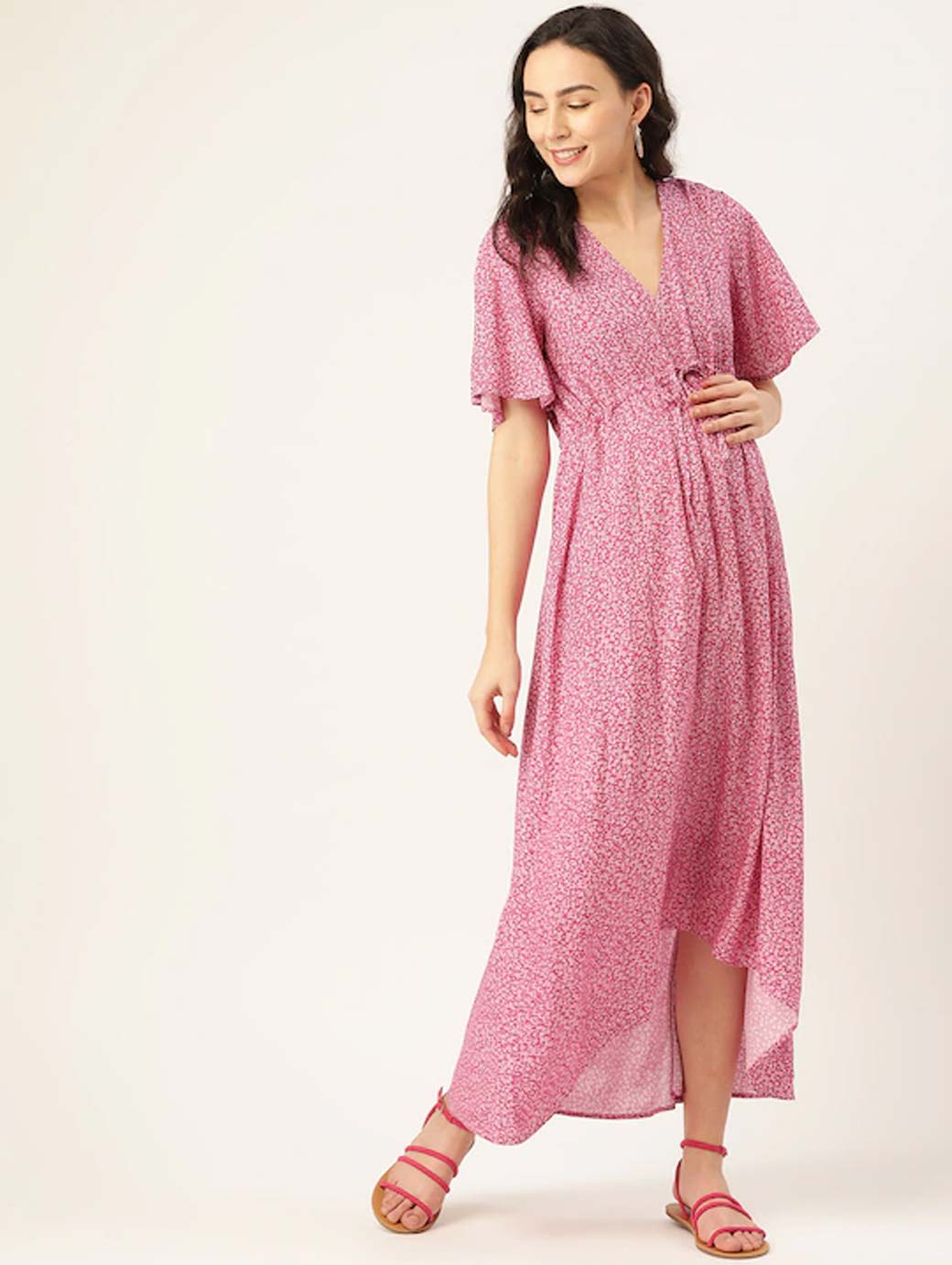 Pink and White printed woven Maternity maxi dress with tie-up, has a V-neck, short sleeves, and high-low hem