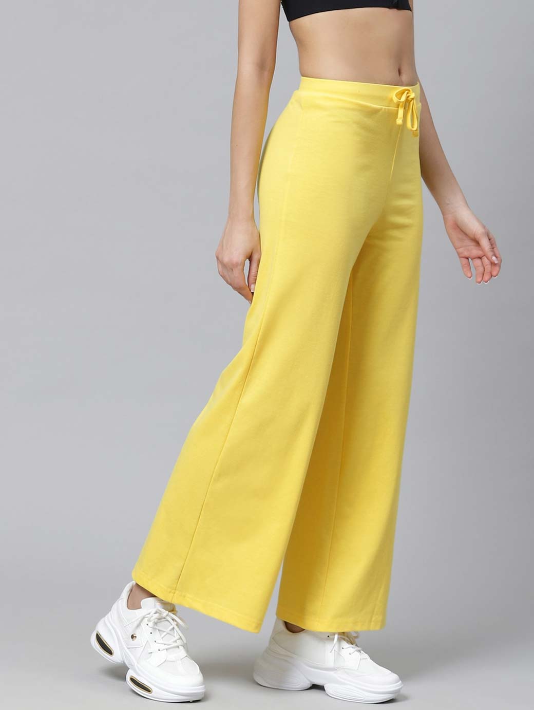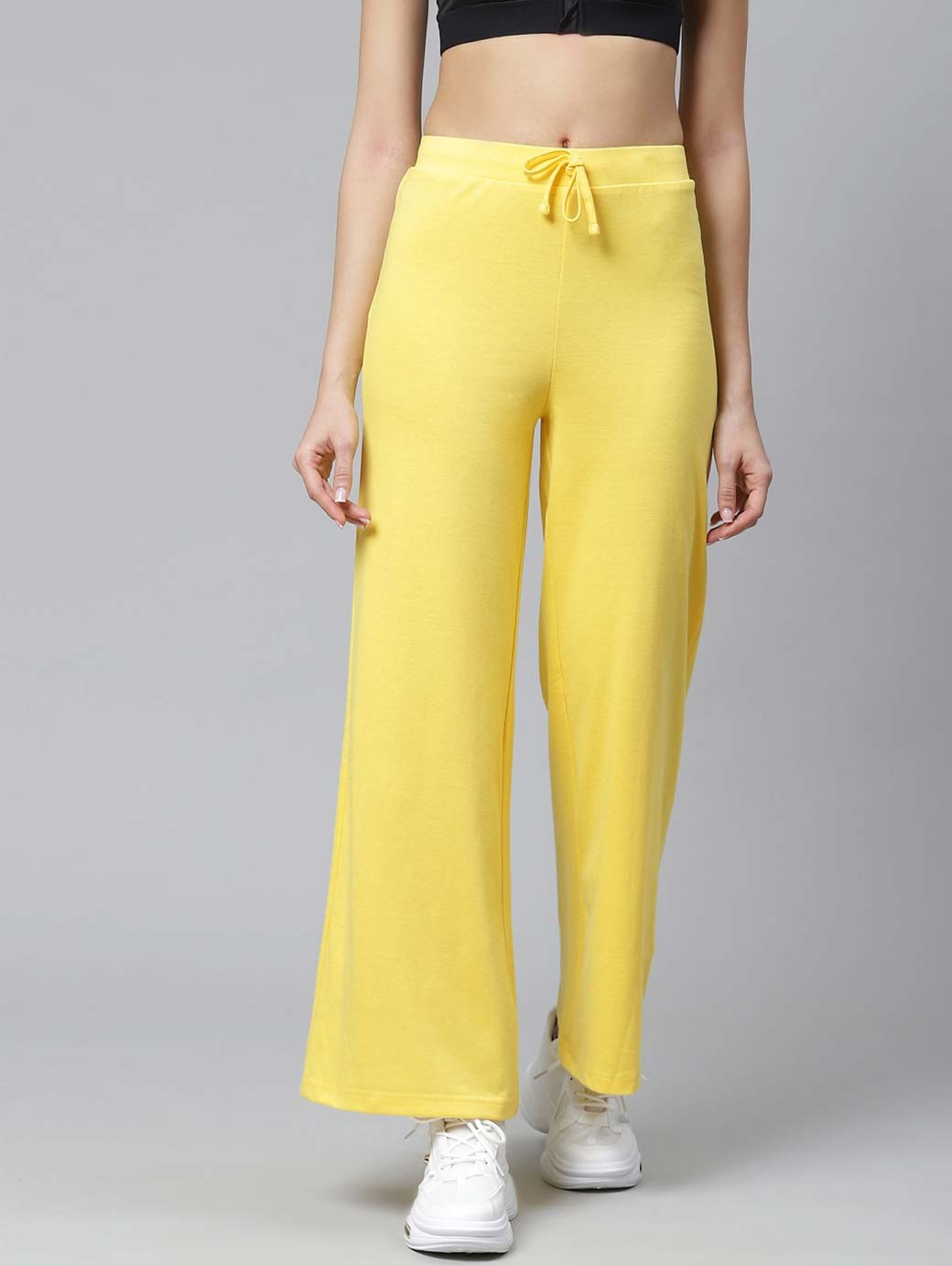 A pair of yellow solid knitted mid-rise track pants, has an elasticated waistband with drawstring fastening