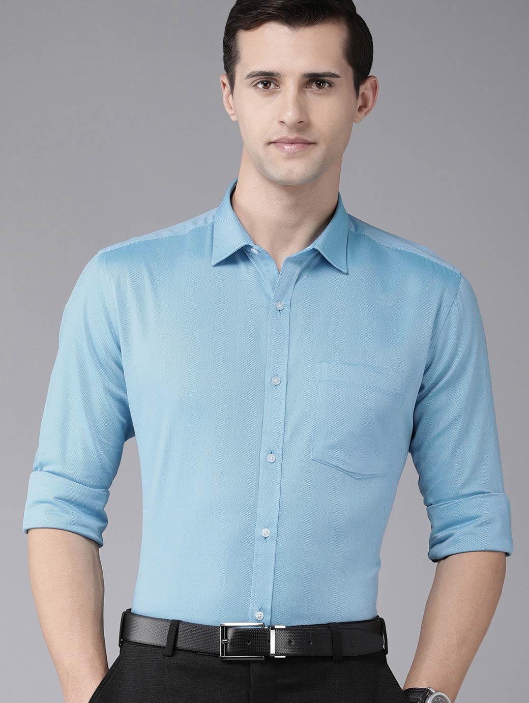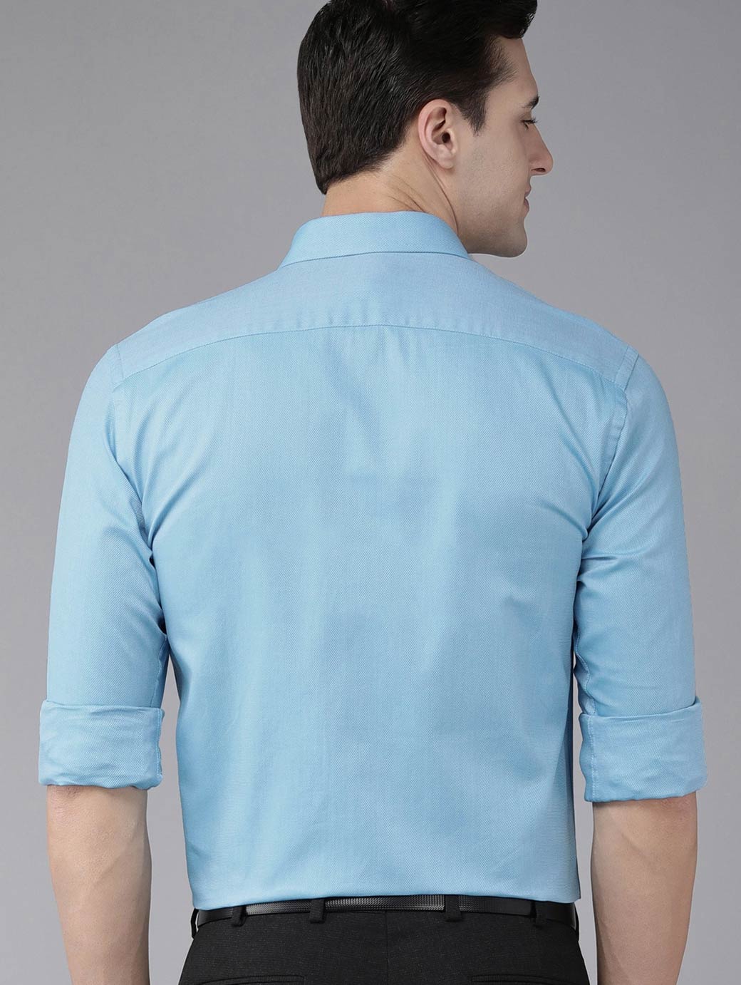 Blue solid opaque Formal shirt ,has a spread collar, button placket, 1 patch pocket, long regular sleeves, curved hem
