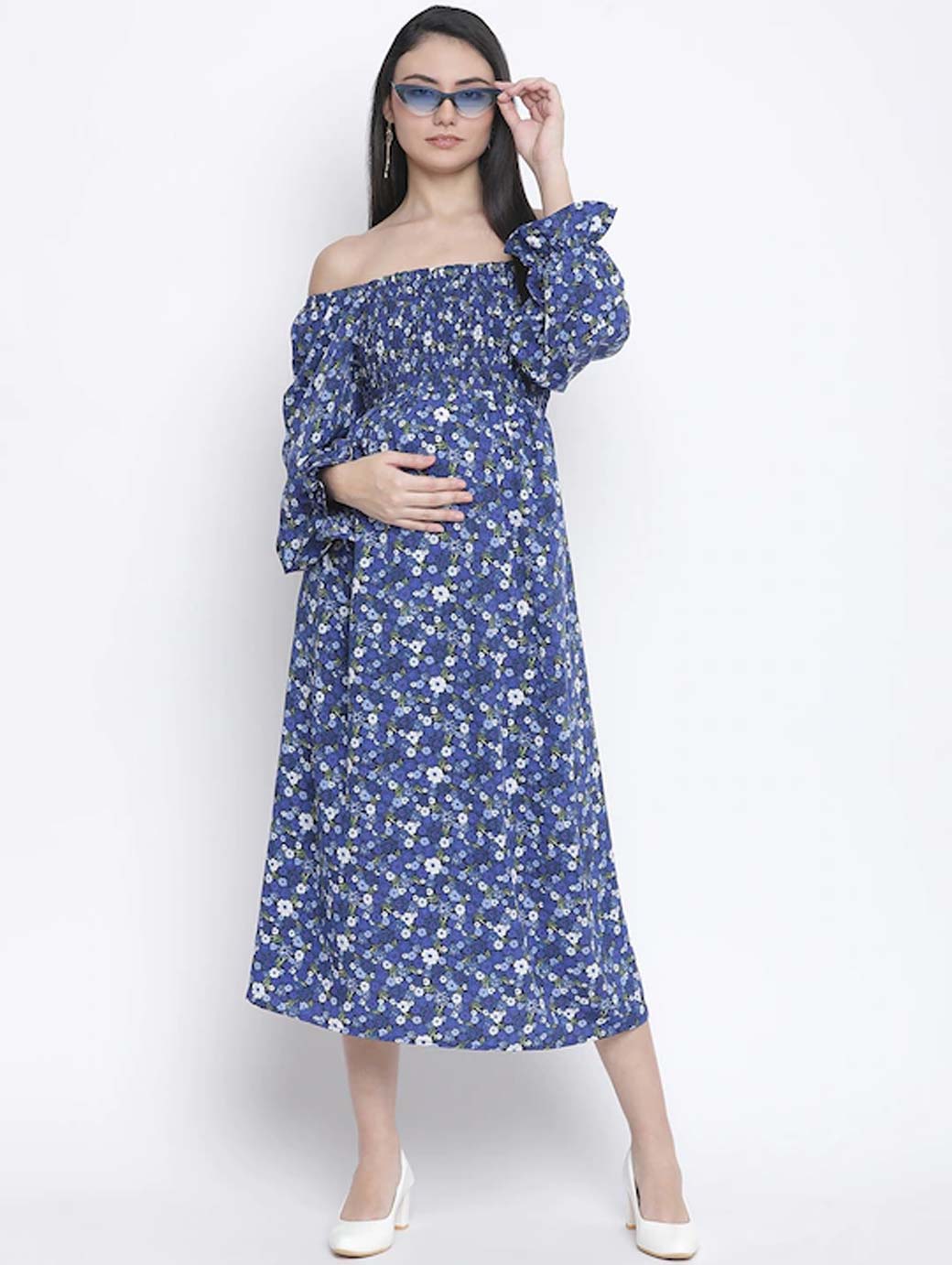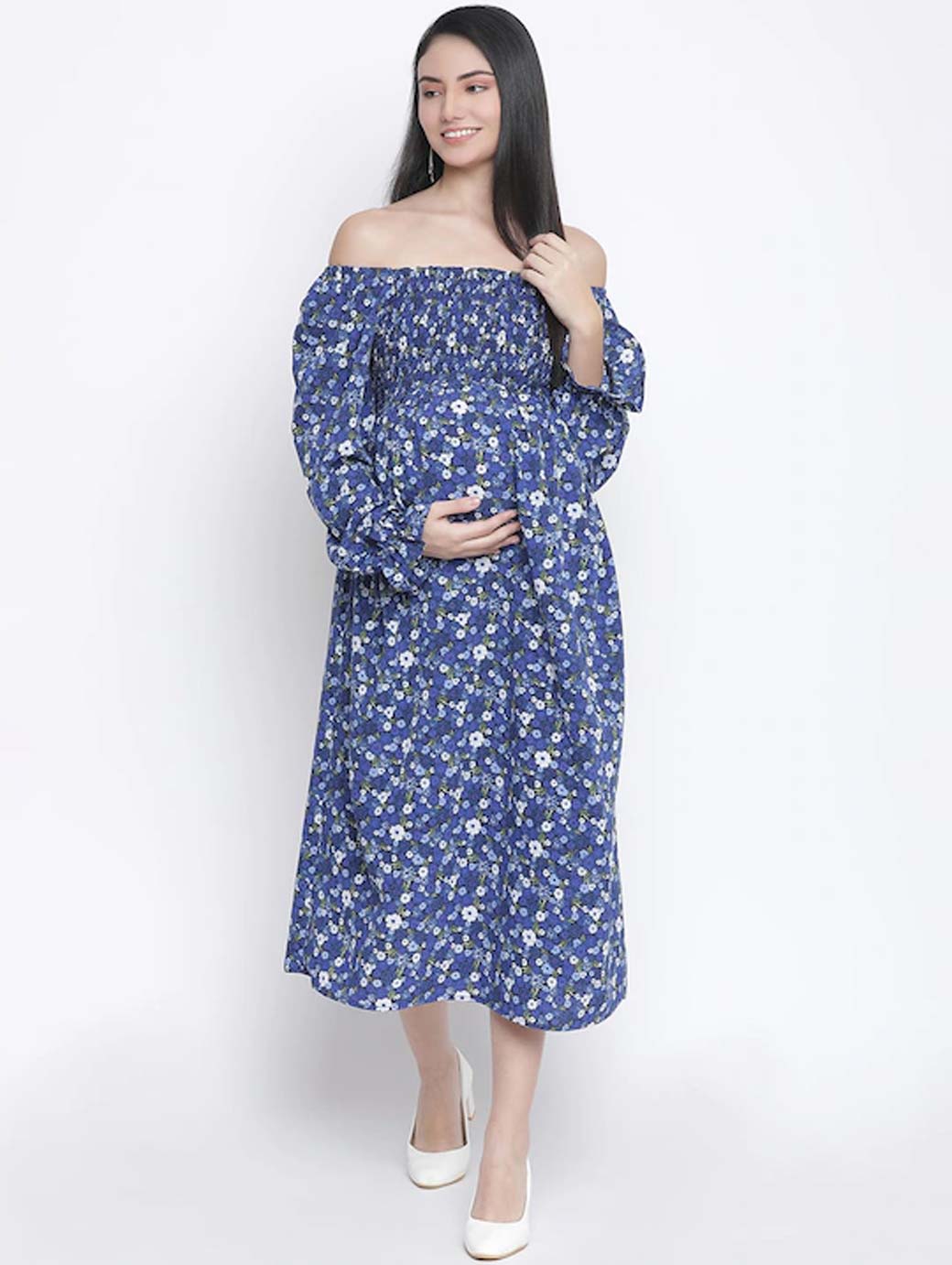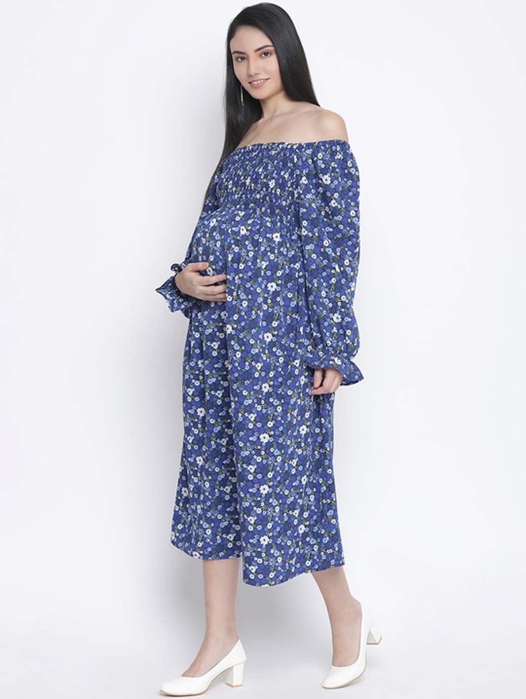 Blue and white floral print fit & flare dress Off-shoulder Long, regular sleeves Midi length in flared hem Satin fabric