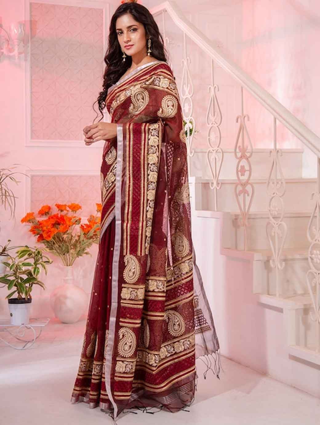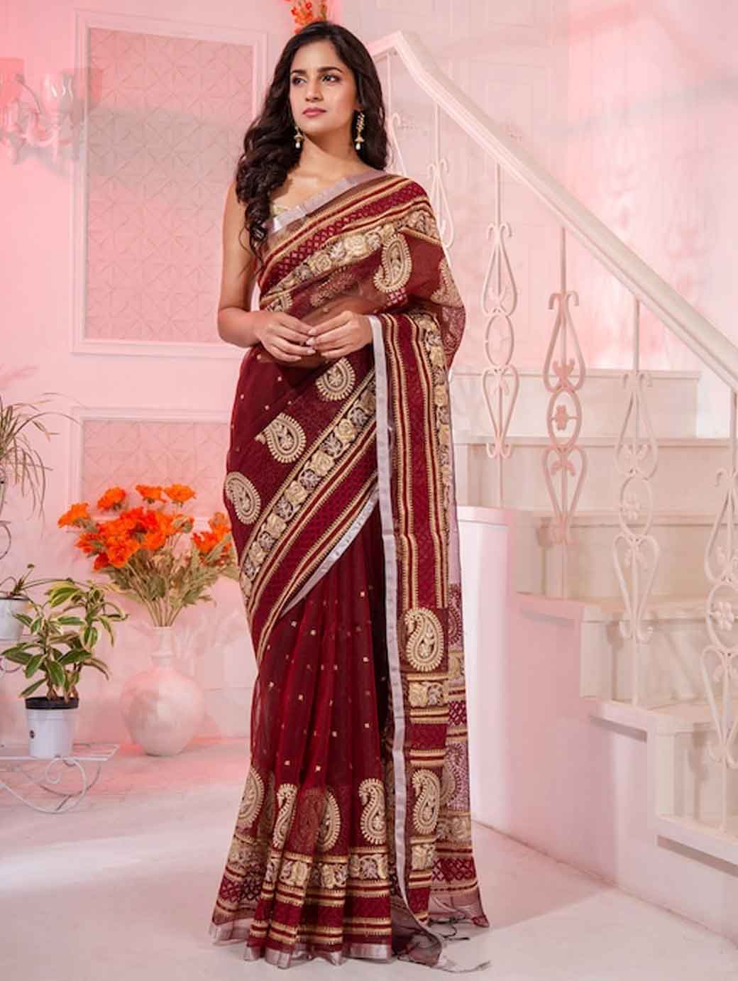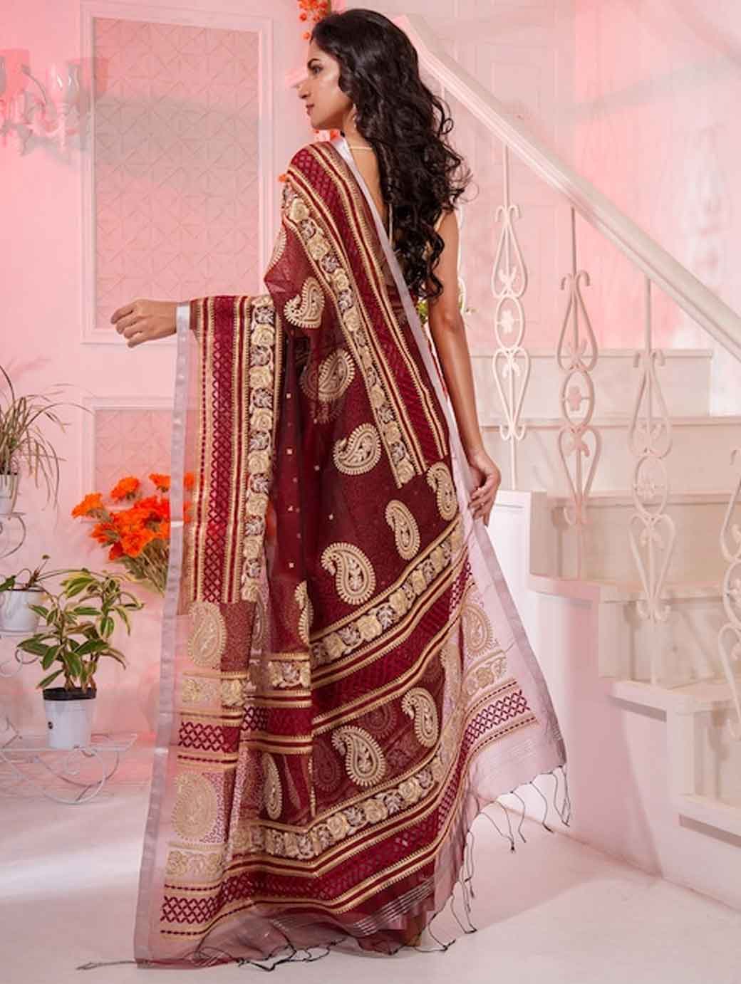Maroon & Gold-Toned Paisley Zari Pure Silk Saree