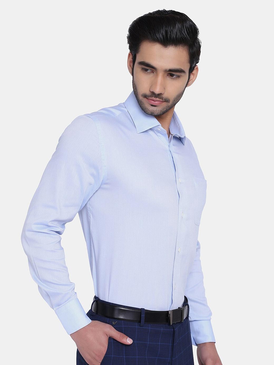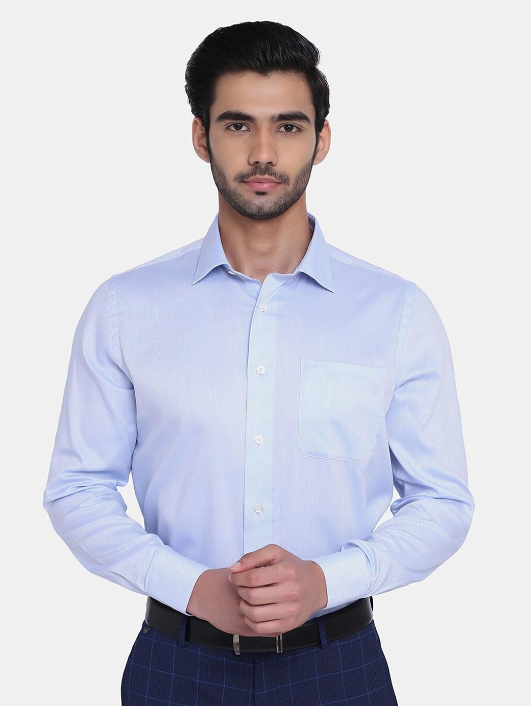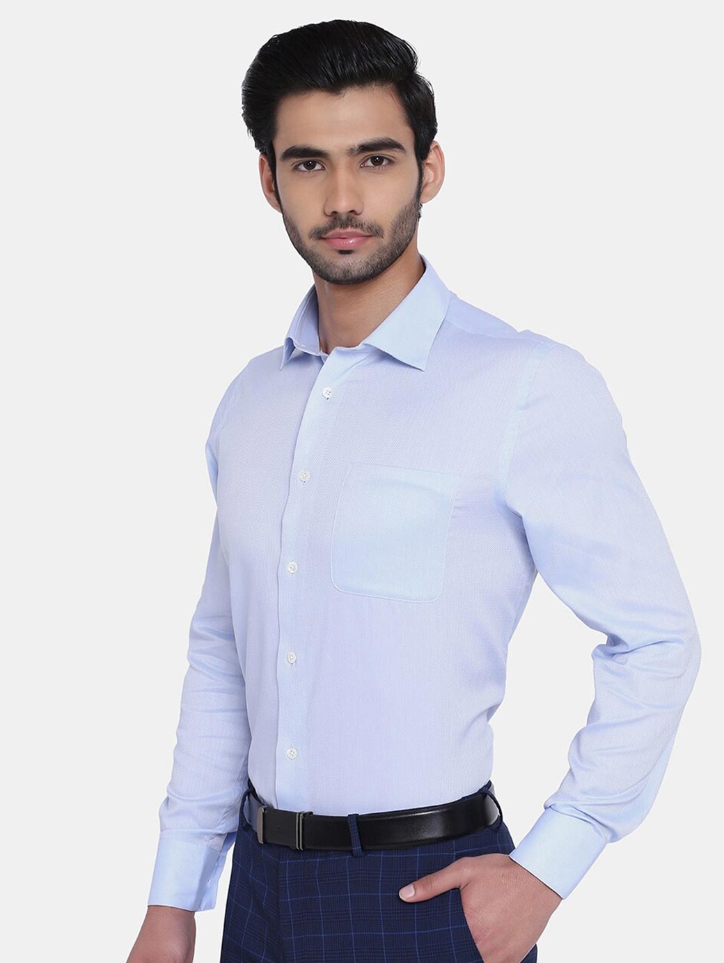 Blue micro ditsy self design opaque Formal shirt ,has a spread collar, button placket, 1 patch pocket, long regular sleeves, curved hem